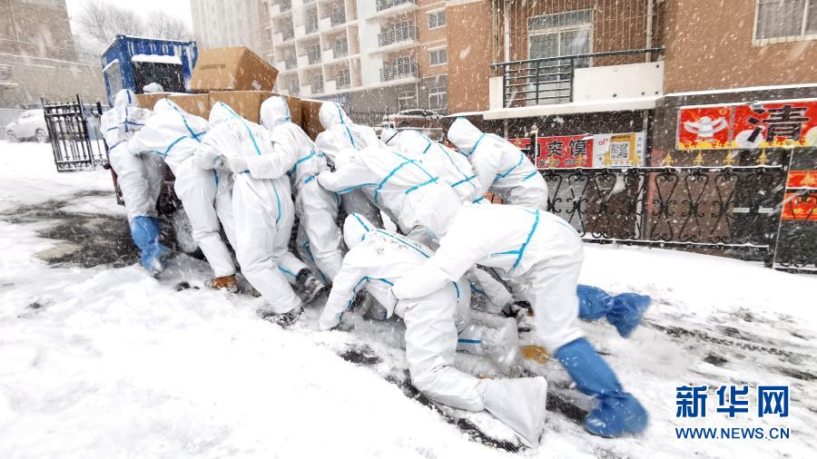 1月6日,大连海洋大学的志愿者们推着满载的三轮车上坡,将物资送到学生宿舍。新华社发(大连海洋大学供图)