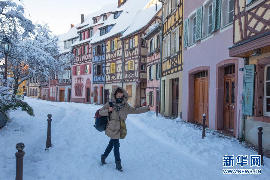 1月15日,在法国上莱茵省科尔马,一名女子走在积雪的路面上。新华社发(亚基·内热朗摄)