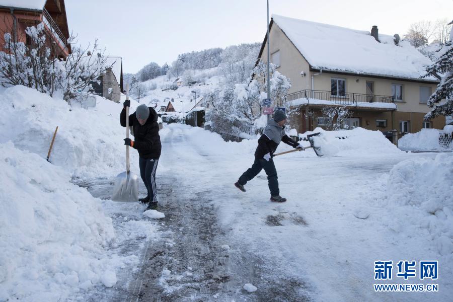 1月16日,在法国上莱茵省弗雷朗,人们清除路面的积雪。新华社发(亚基·内热朗摄)