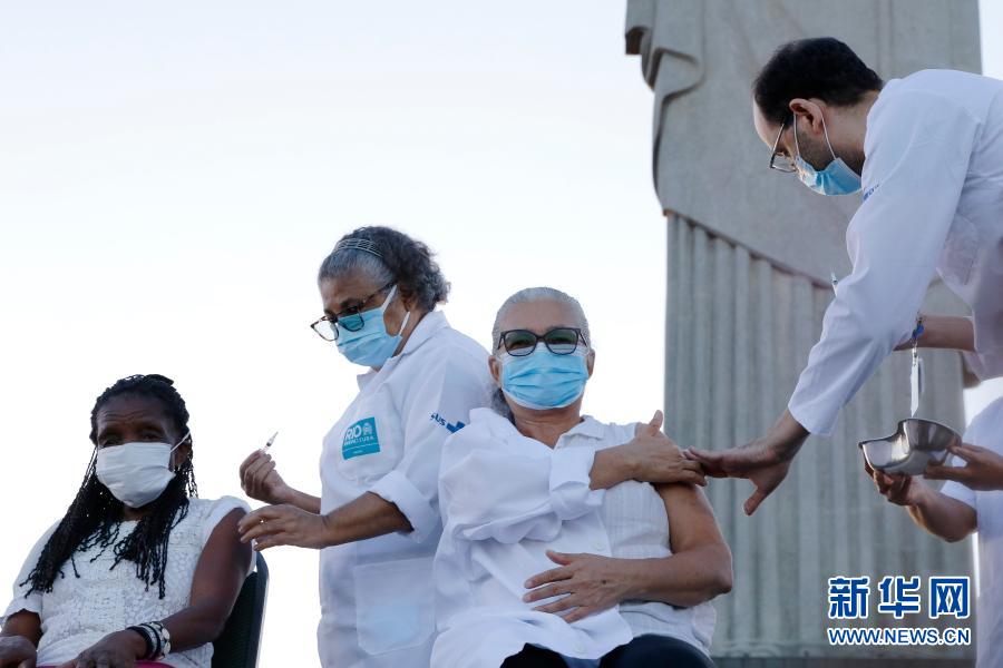 1月18日,在巴西里约热内卢,一家福利院的80岁老人特雷济尼亚·达孔塞桑(左一)和59岁护士杜尔西内亚·达席尔瓦·洛佩斯(右二)在接种中国新冠疫苗。新华社发(巴西国家通讯社供图)