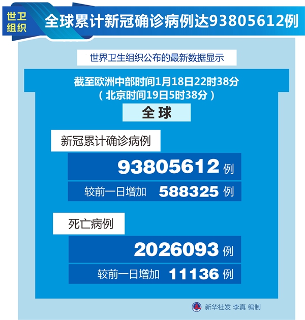 新华社日内瓦1月18日电(记者刘曲)世界卫生组织18日公布的最新数据显示,全球累计新冠确诊病例达93805612例。