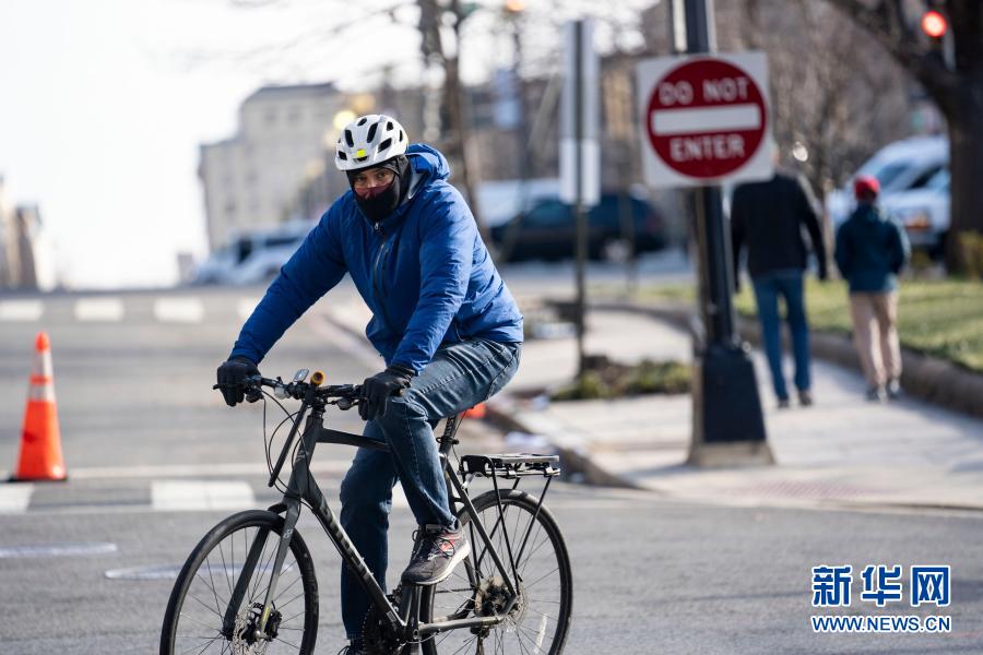 1月18日,在美国华盛顿,一名戴口罩的男子在国会大厦附近骑车。新华社记者刘杰摄