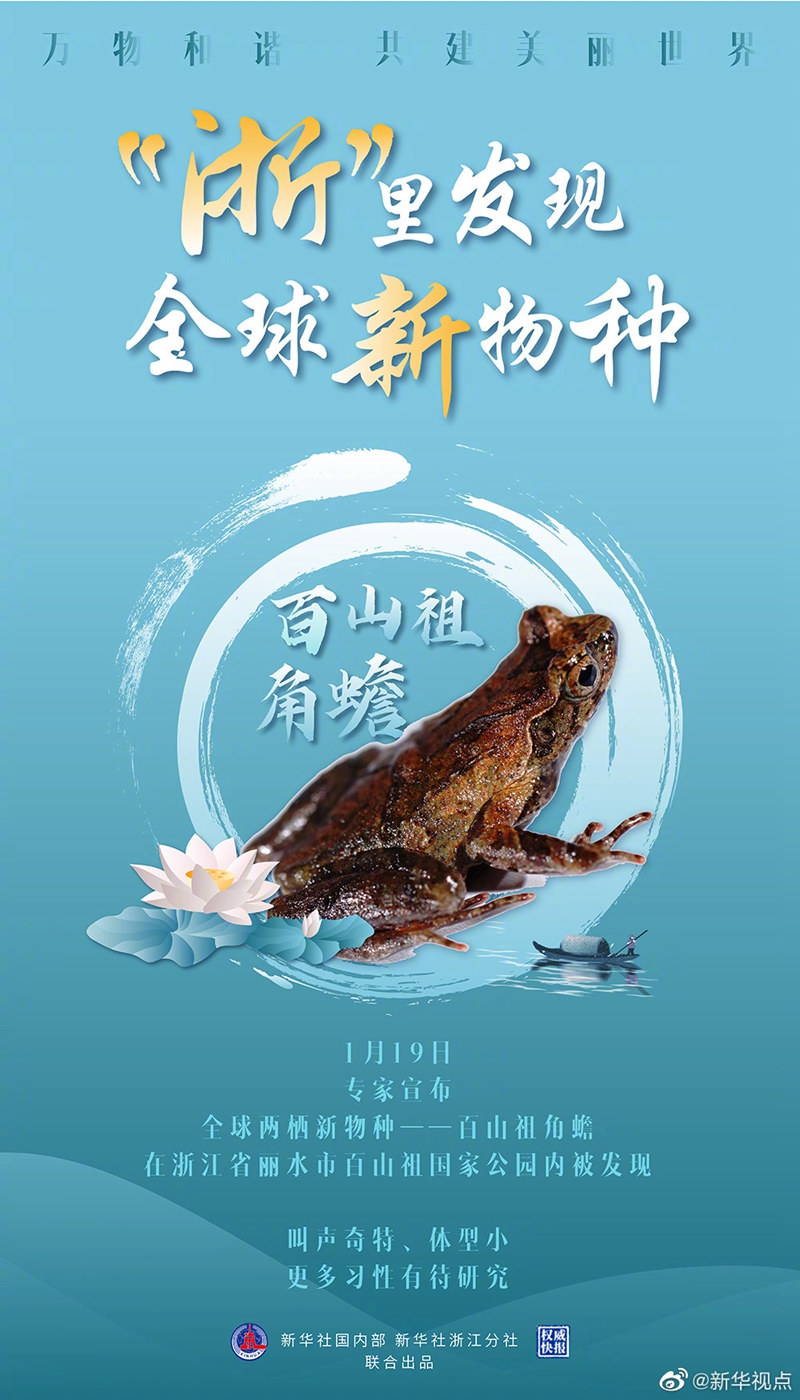 19日,浙江省丽水市生物多样性本底调查(一期)阶段性成果公布。调查中发现的一个两栖动物新物种被命名为百山祖角蟾(Megophrys baishanzuensis)。由生态环境部南京环境科学研究所和中国科学院成都生物研究所联合撰写的描述该物种的论文,已于近日在国际动物分类学权威期刊《ZooKeys》上发表。(记者:赵悦、魏一骏,海报设计:徐乐静)