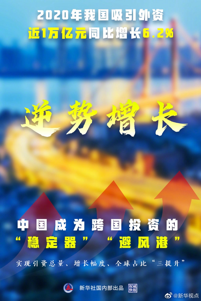 新冠肺炎疫情冲击下,全球跨国投资大幅下降,中国引资却逆势增长。商务部1月20日发布数据显示,2020年我国非金融领域实际使用外资9999.8亿元人民币,同比增长6.2%,实现了引资总量、增长幅度、全球占比“三提升”。中国成为跨国投资的“稳定器”和“避风港”。(记者于佳欣)