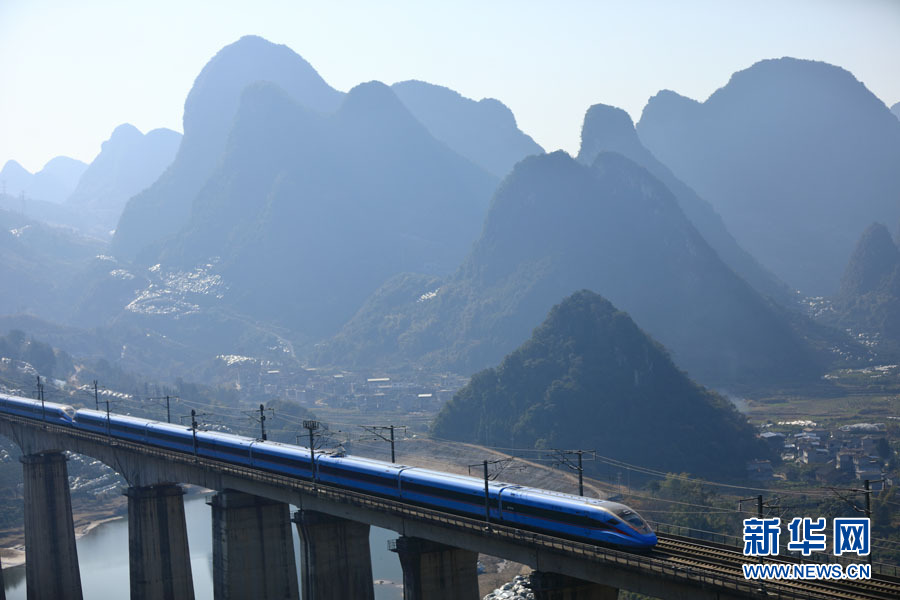 新型复兴号动车组列车行驶在阳朔幸福源大桥上。(伍光钦 摄)