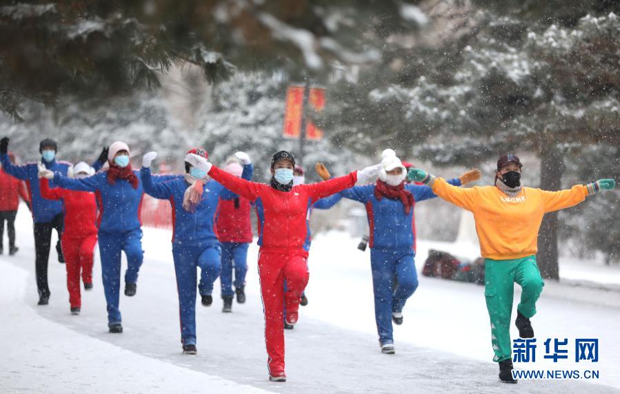 一场大雪过后,一群晨练者在沈阳市北陵公园里带着口罩锻炼身体(1月15日摄)。新华社记者 姚剑锋 摄