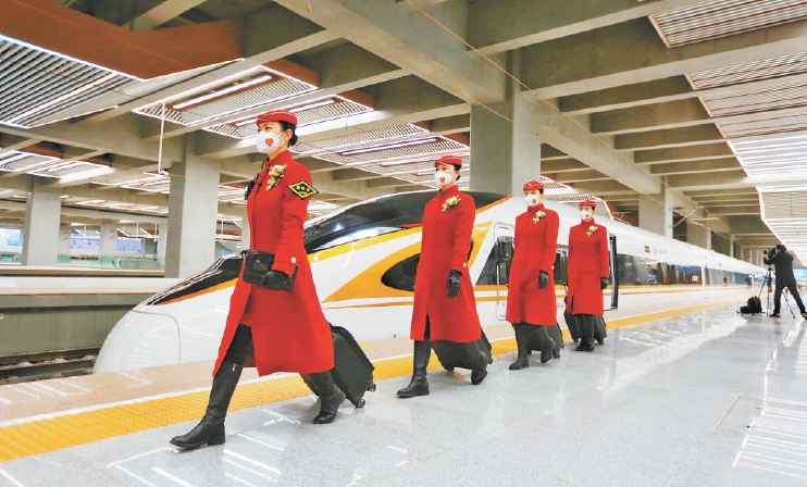虽然戴着口罩,一身红装的“高姐”仍然让人眼前一亮。据介绍,北京客运段京哈高铁值乘队伍包括列车长41人,乘务员124人,平均年龄23岁。针对这条线路上韩国等其他国家乘客较多的情况,乘务人员还进行了韩语、英语基础会话学习。