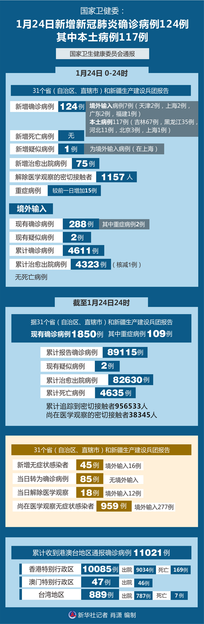 新华社北京1月25日电 国家卫生健康委员会25日通报,1月24日0-24时,31个省(自治区、直辖市)和新疆生产建设兵团报告新增新冠肺炎确诊病例124例,其中境外输入病例7例(天津2例,上海2例,广东2例,福建1例),本土病例117例(吉林67例,黑龙江35例,河北11例,北京3例,上海1例);无新增死亡病例;新增疑似病例1例,为境外输入病例(在上海)。