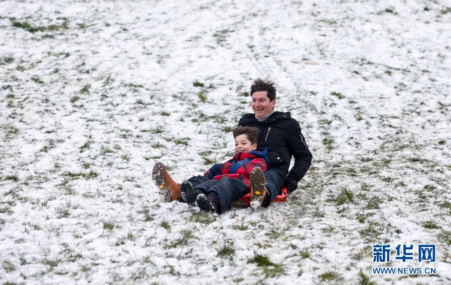 1月24日,人们在英国伦敦享受雪趣。新华社记者韩岩摄