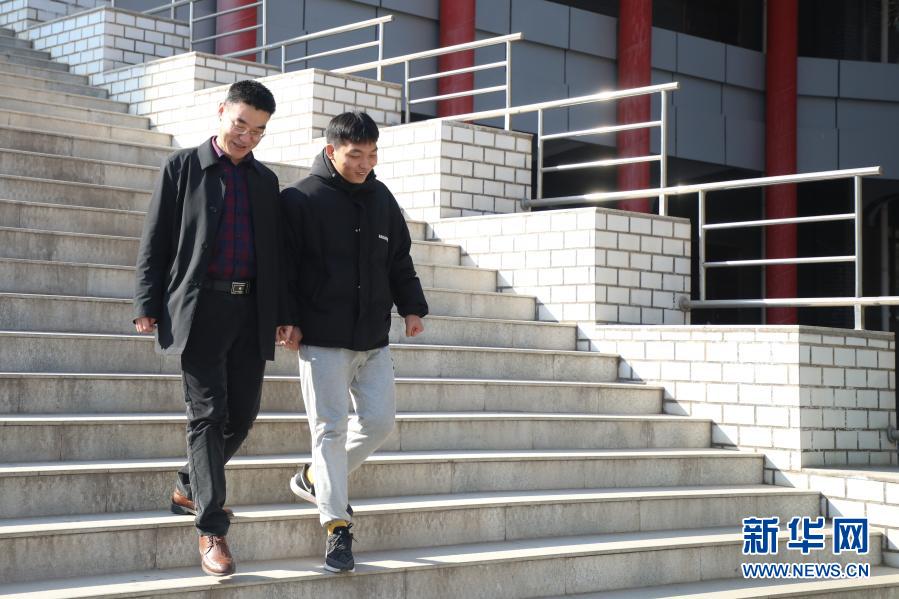 在甘肃农业大学,苌烁森(右)和班主任老师走出办公楼(1月22日摄)。新华社记者 马希平 摄