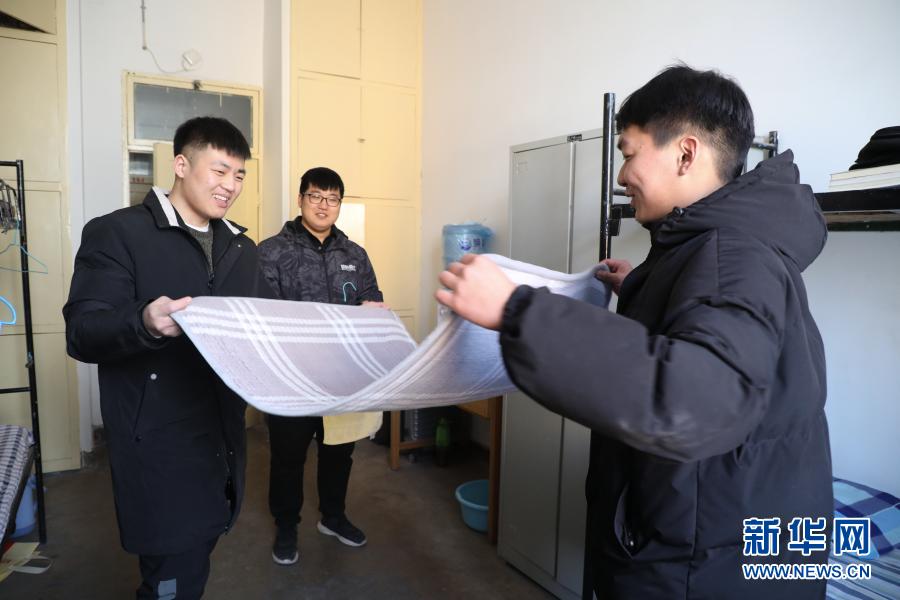 在甘肃农业大学学生宿舍,苌烁森(右一)和舍友整理寝具(1月22日摄)。新华社记者 马希平 摄
