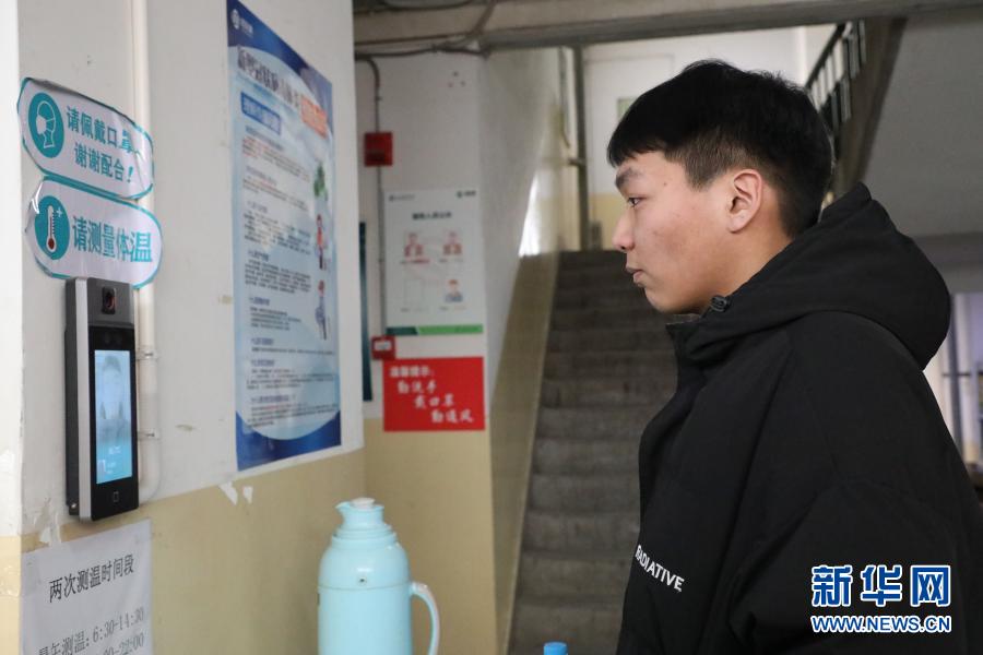 在甘肃农业大学,苌烁森在宿舍楼门口测温(1月22日摄)。新华社记者 马希平 摄