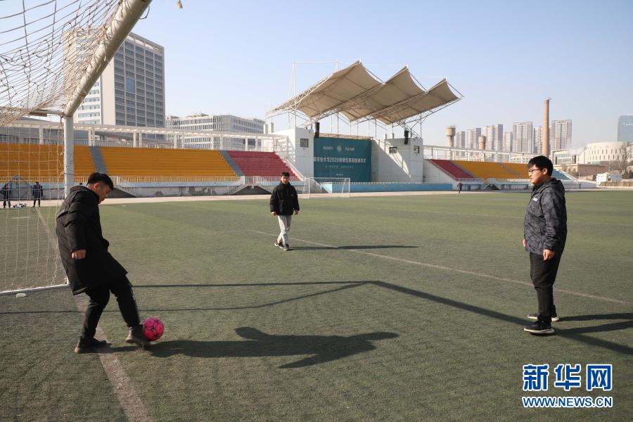 苌烁森(中)和舍友在甘肃农业大学操场上踢球(1月22日摄)。新华社记者 马希平 摄