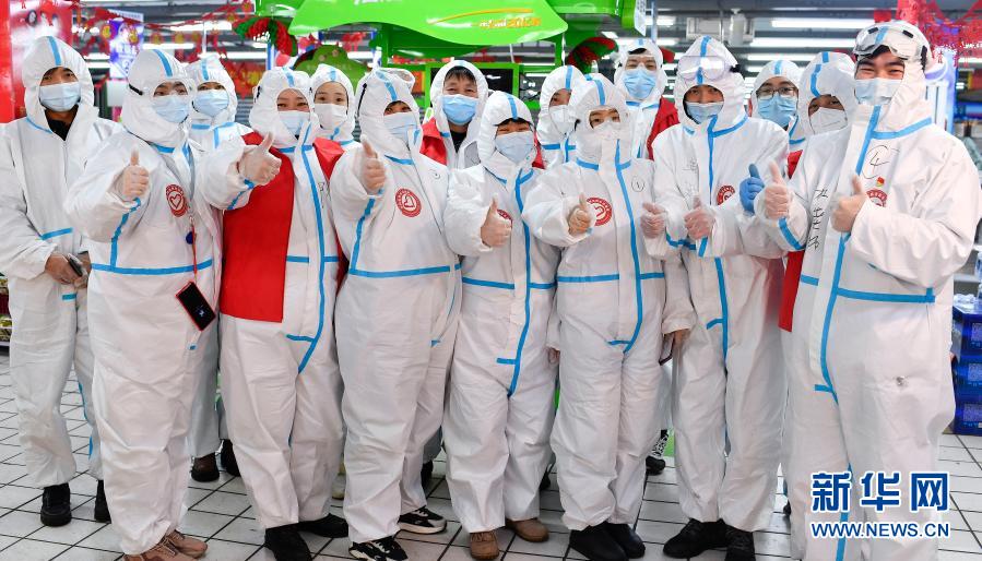在吉林省通化市东昌区某超市内,杜思成(右一)与志愿者同伴们合影(1月24日摄)。新华社记者 许畅 摄