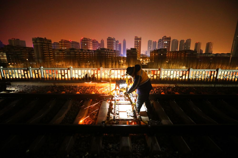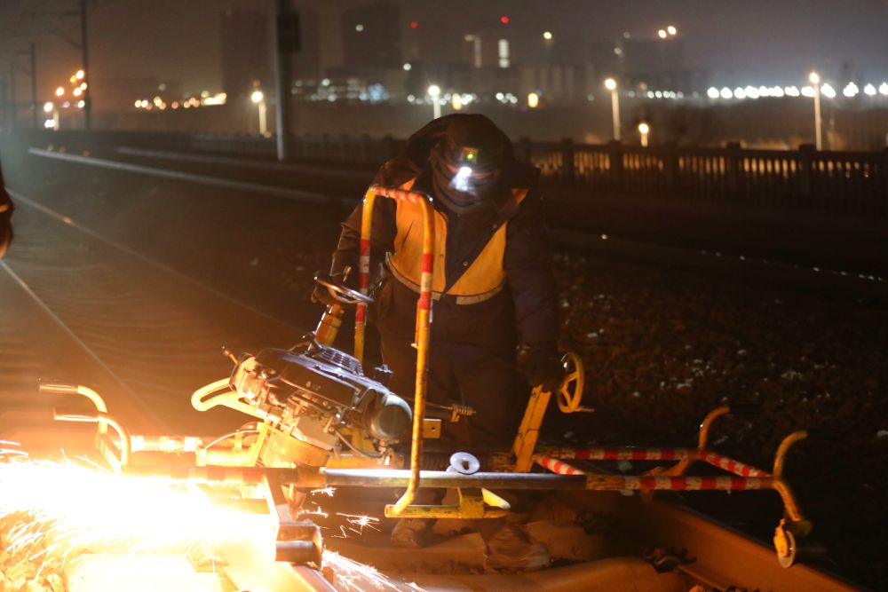 23日凌晨,寒风呼啸,机器轰鸣,鞍山西站内的道岔上光影交错。在高铁运行的“空档期”,张俊达和工友们佩戴头顶灯,身着反光服,推着钢轨打磨机平稳地在线路上匀速行进。在砂轮与钢轨接触的地方,溅起串串火花。