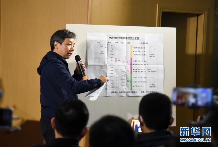 1月25日,山东笏山金矿事故现场救援组组长陈玉民在新闻发布会现场向媒体记者介绍情况。新华社记者 王凯 摄