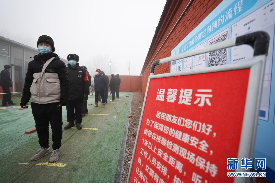 1月26日,在北京市大兴区北臧村镇一处核酸检测点,参加核酸检测的人员在排队等候采样。新华社记者 鞠焕宗 摄