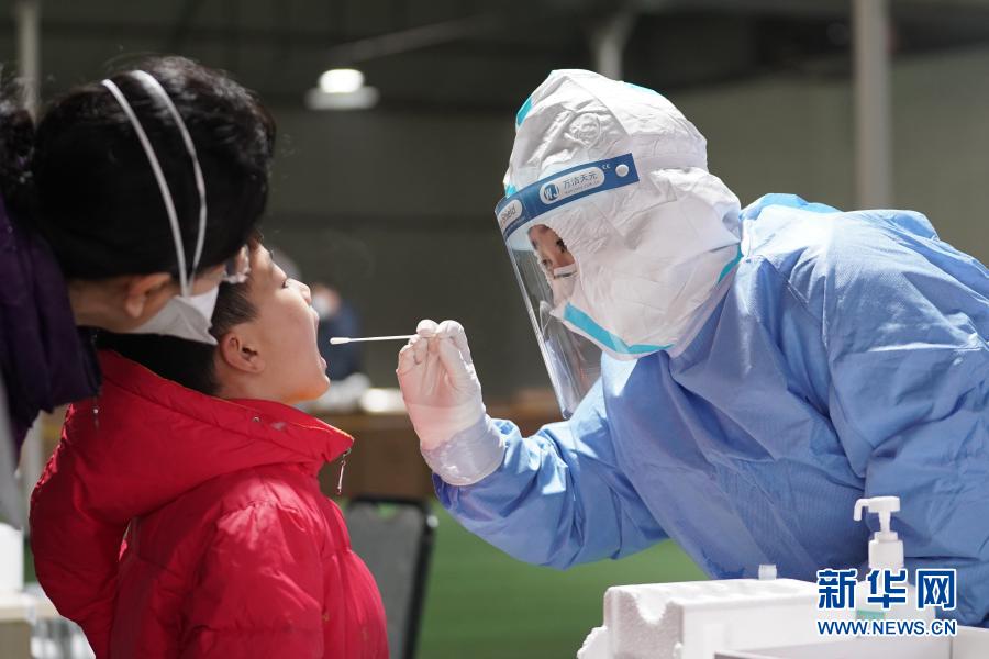 1月26日,在北京市大兴区北臧村镇一处核酸检测点,北臧村镇卫生院医护人员王亚鑫(右)为参加核酸检测的人员采样。新华社记者 鞠焕宗 摄
