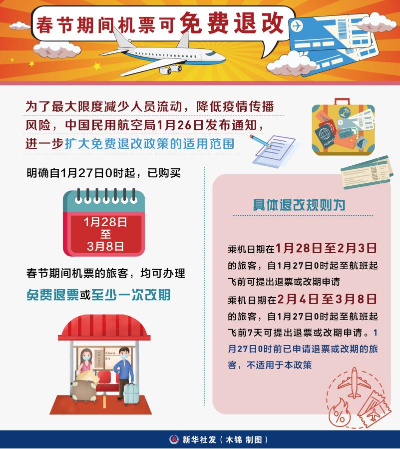 新华社北京1月26日电(记者周圆)为了最大限度减少人员流动,降低疫情传播风险,中国民用航空局26日发布通知,进一步扩大免费退改政策的适用范围,明确自1月27日0时起,已购买1月28日至3月8日春节期间机票的旅客,均可办理免费退票或至少一次改期。