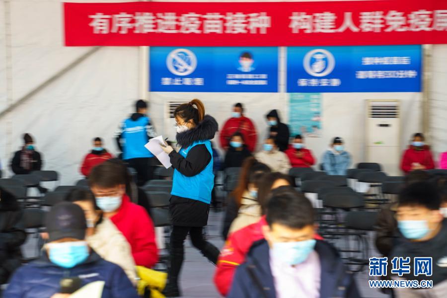 1月26日,在设立于北京市朝阳规划艺术馆的接种点,志愿者在观察区工作。新华社记者 刘金海 摄