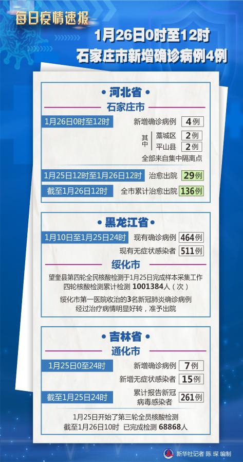 新华社北京1月26日电 1月26日,河北省石家庄市新冠肺炎疫情防控工作新闻发布会上,石家庄市副市长孟祥红介绍,1月26日0时至12时,石家庄市新增新冠肺炎确诊病例4例,其中藁城区2例、平山县2例,全部来自集中隔离点。1月25日12时至1月26日12时,治愈出院29例。截至1月26日12时,全市累计治愈出院136例。