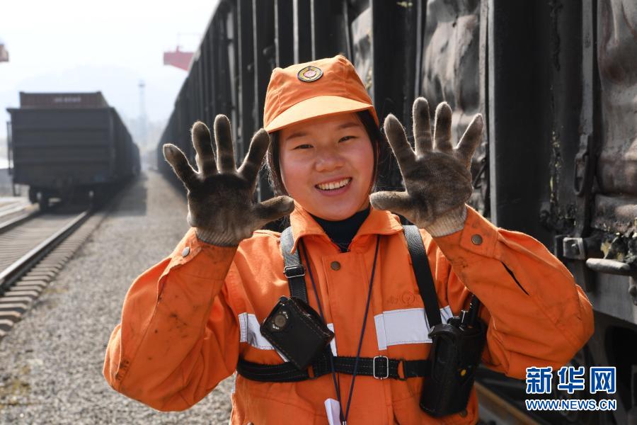 1月26日,在福建上杭火车站,调车员丘丽榕完成一项作业后展示手套。