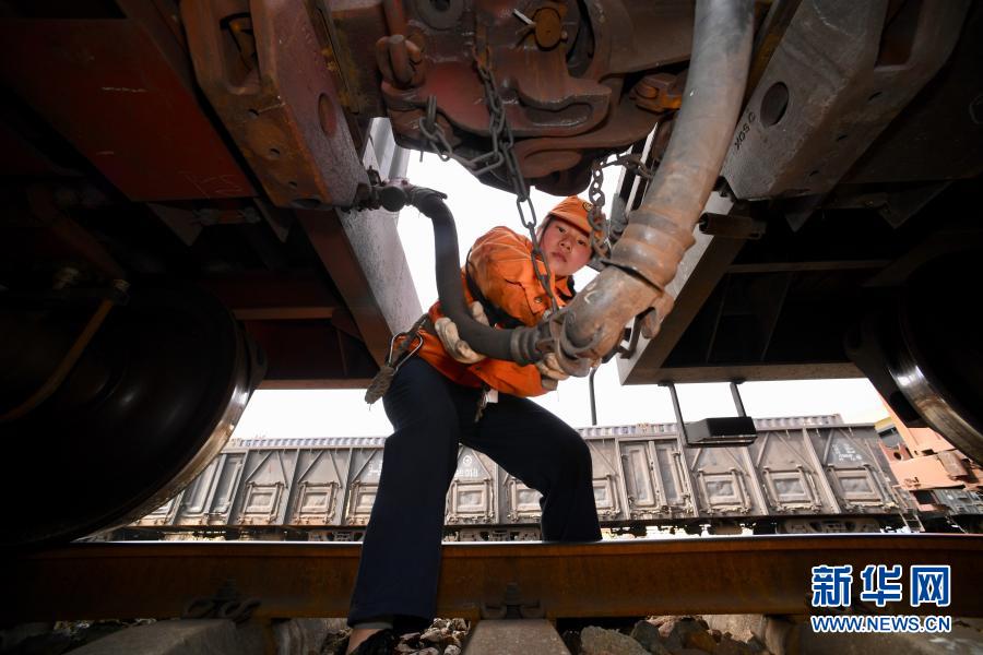 1月26日,在福建上杭火车站,调车员丘丽榕在列车两车之间摘开制动风管。新华社记者姜克红摄