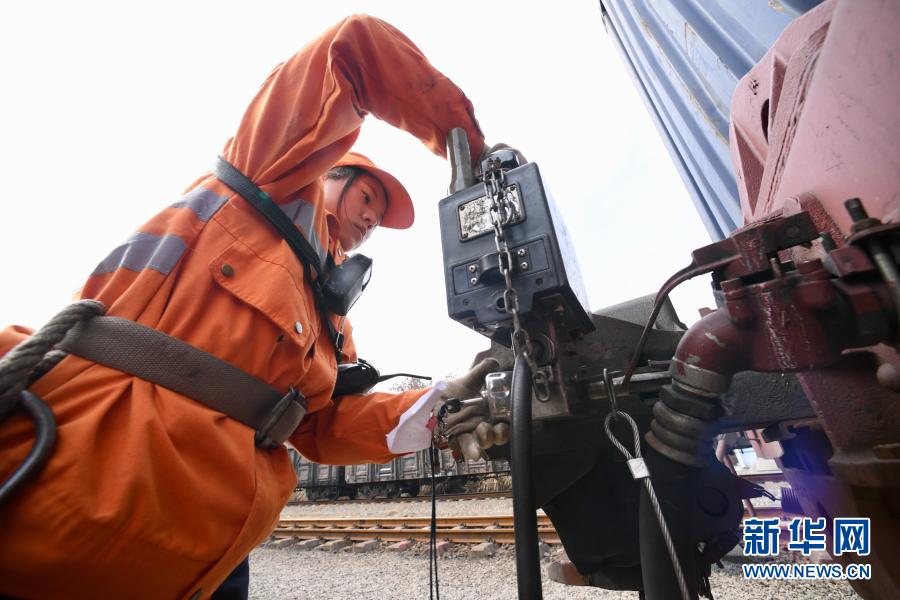 1月26日,在福建上杭火车站,调车员丘丽榕在列车尾部安装列尾装置。新华社记者姜克红摄