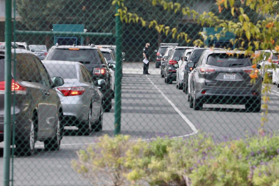 1月13日,在美国加利福尼亚州奥兰治县阿纳海姆市的迪士尼乐园停车场,当地民众在车上排队等待接种新冠疫苗。(新华社发)