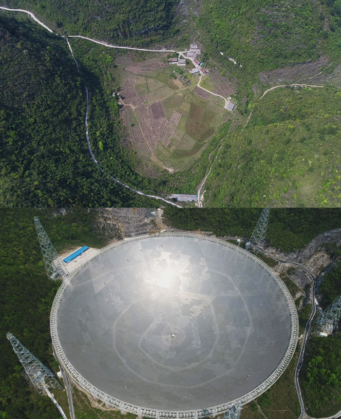 2017年4月13日,航拍的“中国天眼”和附近村民居住的窝凼对比影像(拼版照片)。新华社发(卢志佳摄)