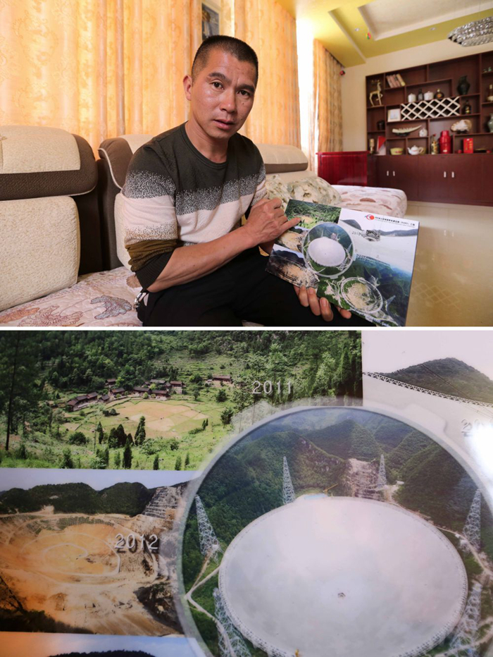 大窝凼移民杨天觉在新房中展示位于大窝凼的老家及“天眼”建设过程的图片(拼版照片,2017年4月13日摄)。新华社发(卢志佳摄)