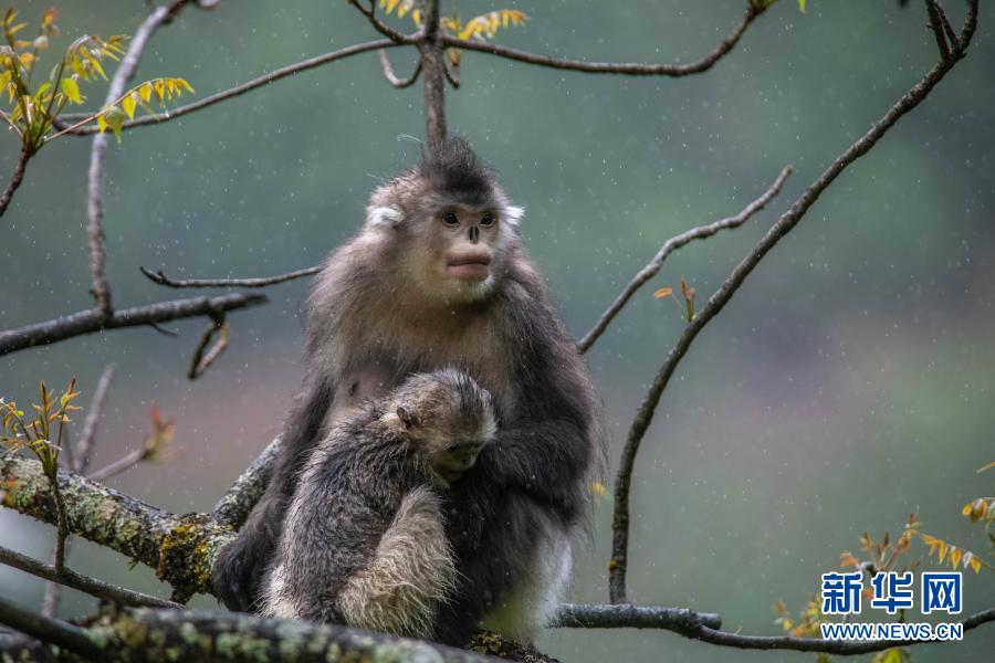 这是云南迪庆藏族自治州香格里拉滇金丝猴国家公园里的滇金丝猴(2020年5月23日摄)。新华社记者 胡超 摄
