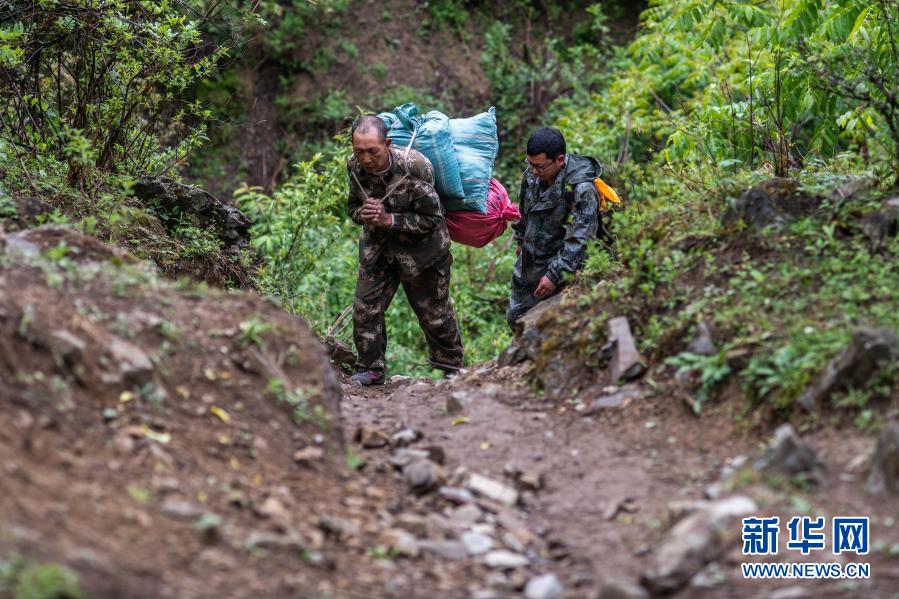 在云南省迪庆藏族自治州香格里拉滇金丝猴国家公园,护猴员余小德(左)背着喂滇金丝猴的食物上山(2020年5月23日摄)。新华社记者 胡超 摄