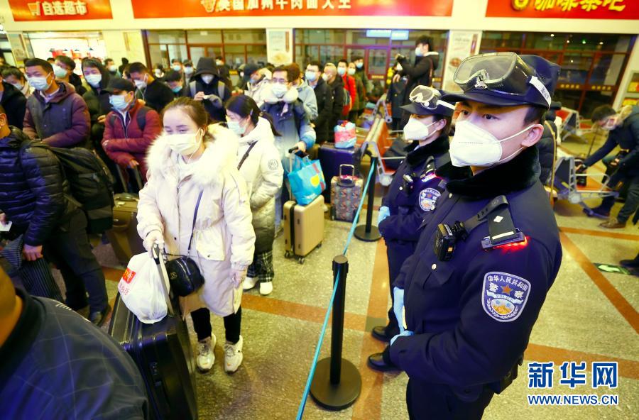 1月28日,北京铁路公安局民警在北京站进行进站安全执勤。