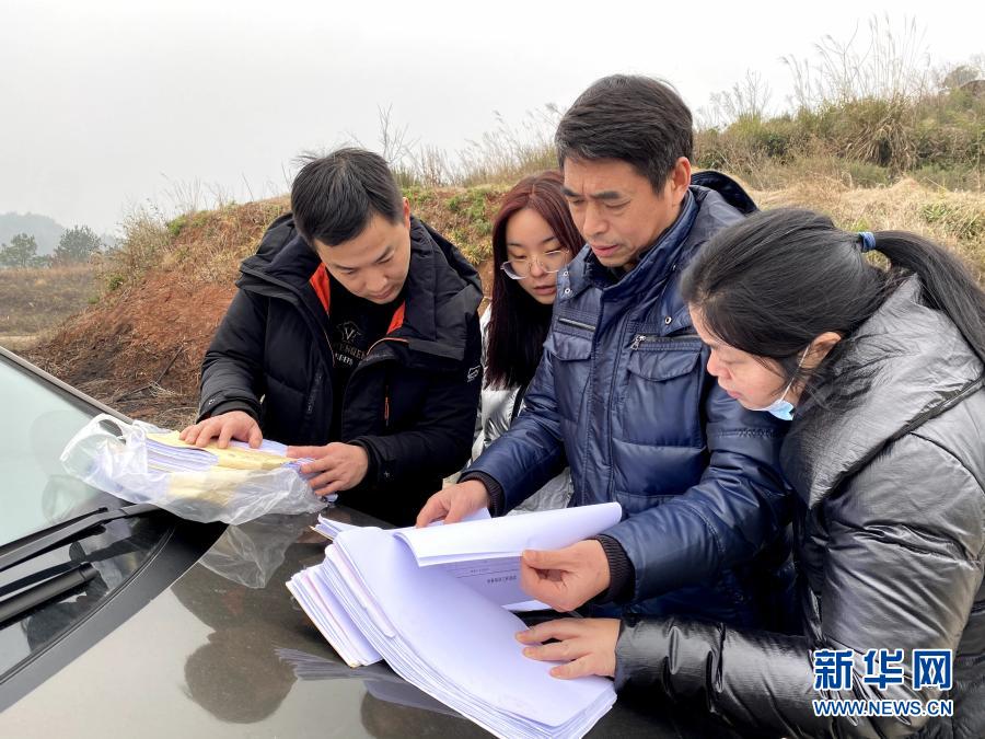 1月27日,驻麻溪口村帮扶工作队队长段吉广(右二)在村内和同事们一起核查工程项目账目资料。新华社记者 柳王敏 摄