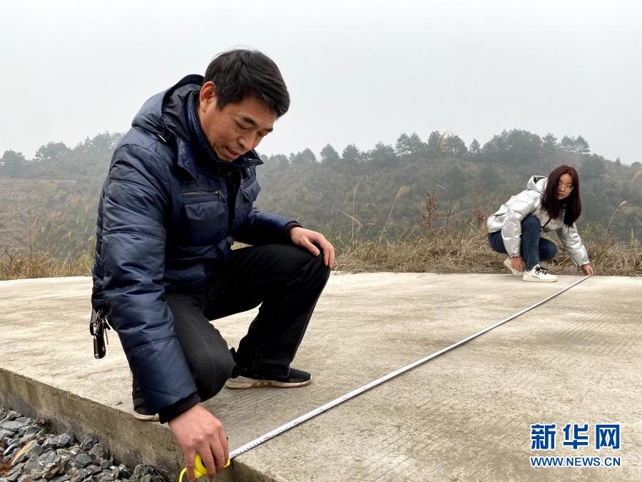 1月27日,驻麻溪口村帮扶工作队队长段吉广(左)在村内进行新建道路的测量。新华社记者 柳王敏 摄