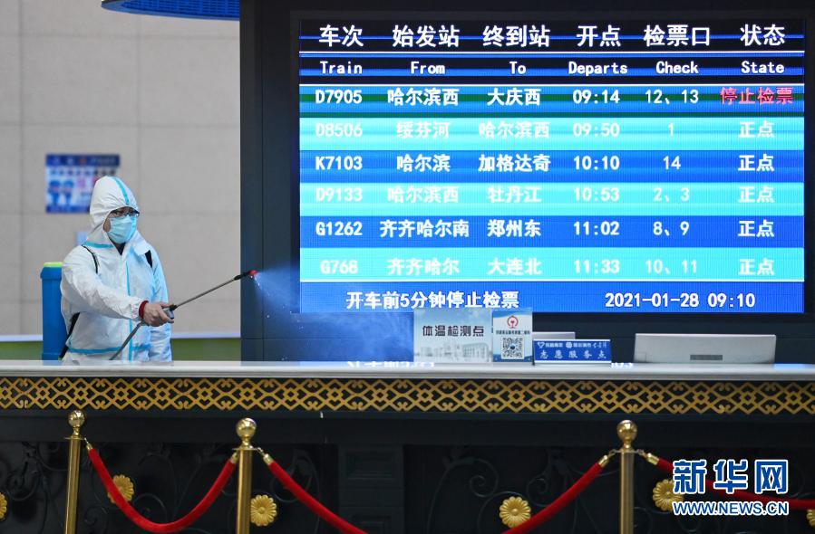 1月28日,在哈尔滨火车站候车厅,工作人员对中央服务台进行消毒。新华社记者 王建威 摄