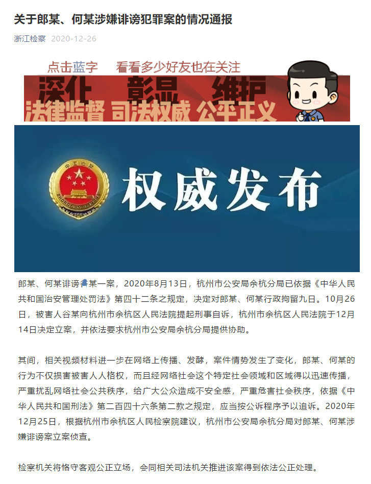 2020年12月14日,余杭区人民法院决定立案。就在公众关注这起不多见的刑事自诉案进展的时候,事件出现了重大的转变。12月25日,根据杭州市余杭区人民检察院建议,杭州市公安局余杭区分局对郎某、何某以涉嫌诽谤刑事立案侦查。