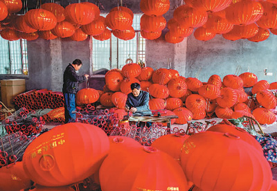 近年来,浙江省台州市仙居县横溪镇依托灯笼制作传统手工技艺,发展大红灯笼加工产业,带动村民在家门口就业增收。图为日前横溪镇三枣园村农民正在赶制大红灯笼。陈月明摄(人民视觉)
