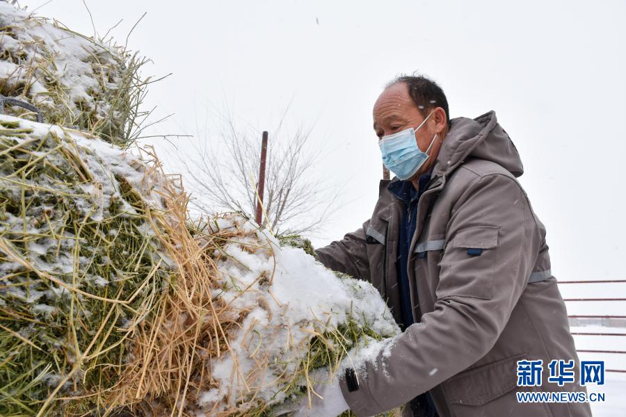 1月23日,在新疆吉木萨尔县野马繁殖研究中心,高守勤搬运饲料准备给野马喂食。新华社记者 高晗 摄