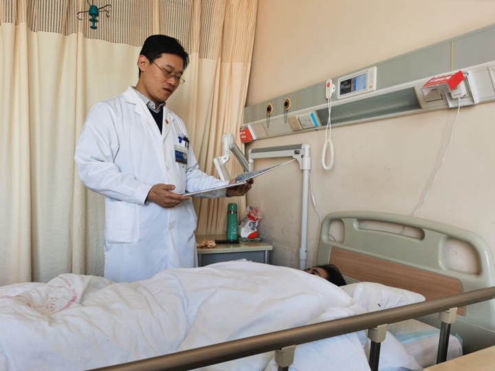 王智超在病房询问患者身体情况。(上海交大医学院附属第九人民医院提供)