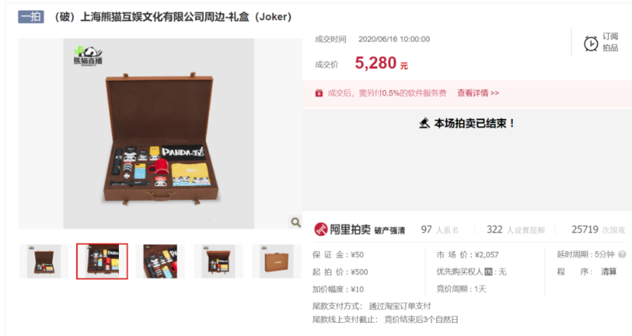 早在2020年6月,熊猫互娱就对其周边产品进行过一次拍卖,主要标的为周边礼盒、福袋、马克杯、手机壳等。这些限量款周边受到热捧,最后也是高溢价率拍出。其中,一款礼盒起拍价为500元,最终成交价5289元,溢价率达958%;一个起拍价150元的福袋卖出2020元,溢价率1246.67%。