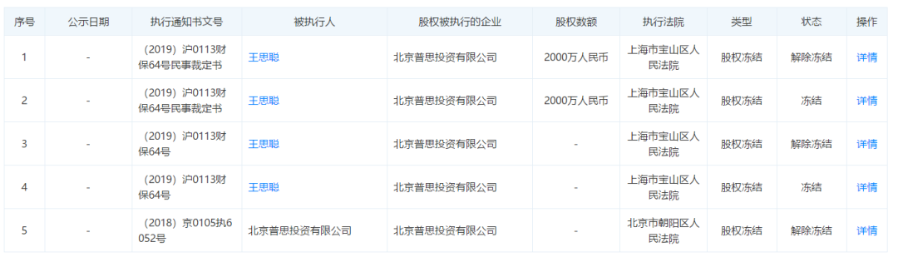 天眼查数据显示,普思资本曾多次被法院执行股权冻结,王思聪被列为被执行人。