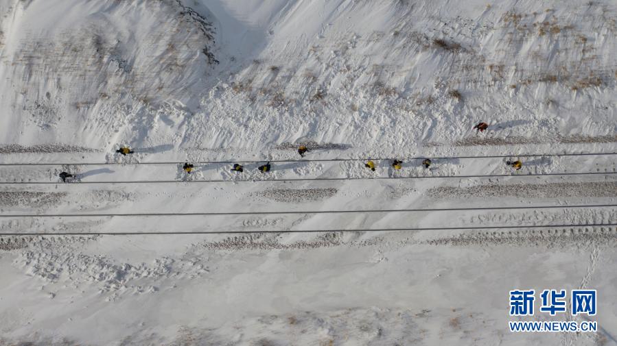 1月29日,中国铁路呼和浩特局集团有限公司锡林浩特综合维修段职工清理铁路线上的积雪(无人机照片)。