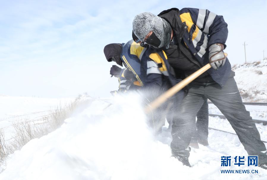 1月29日,中国铁路呼和浩特局集团有限公司锡林浩特综合维修段职工清理铁路线上的积雪。