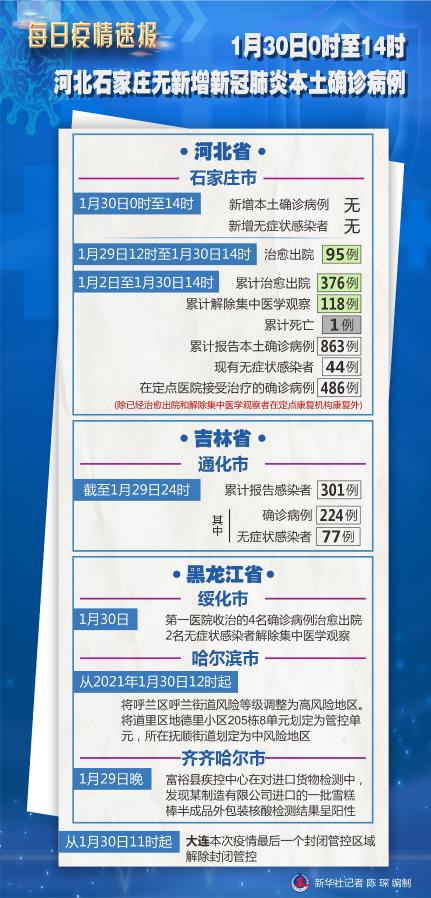 新华社北京1月30日电 30日0时至14时,石家庄市无新增新冠肺炎本土确诊病例,无新增新冠肺炎无症状感染者。