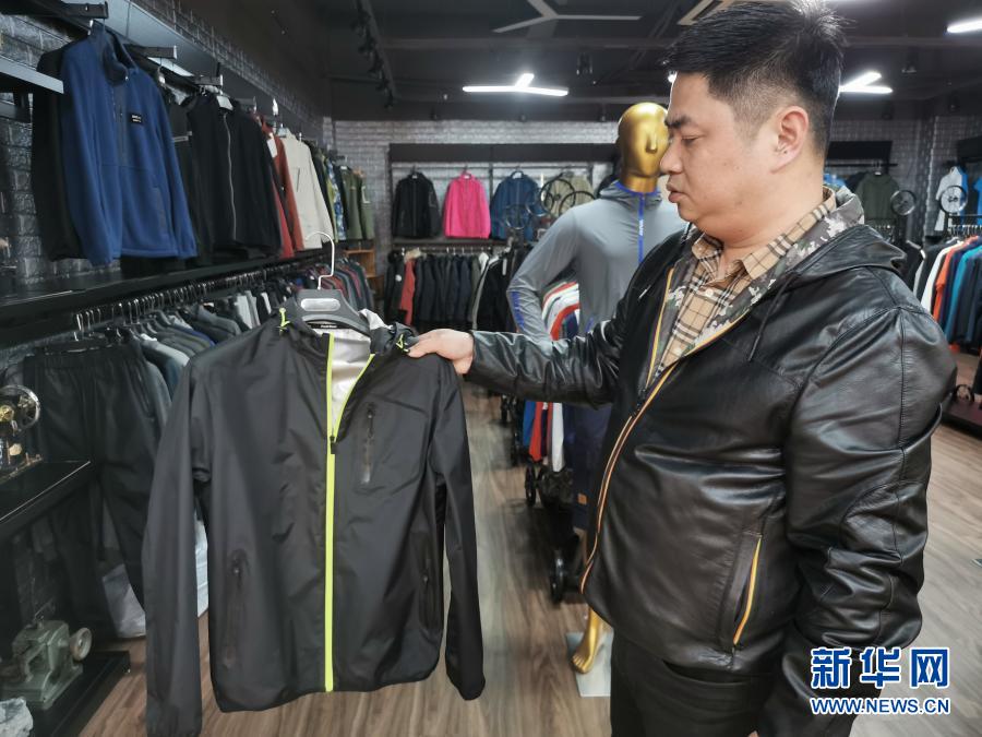 石狮市青年商会副会长洪我议展示具有防水功能的冲锋衣(1月27日摄)。新华社记者凡帅帅 摄