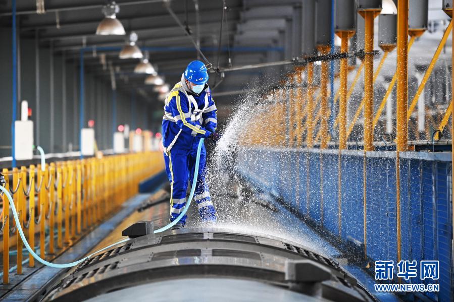 在中国铁路哈尔滨局集团有限公司三棵树车辆段的整备库,工作人员为往返于哈尔滨与广州间的Z237/8次旅客列车洗刷车顶(2月1日摄)。新华社记者 王建威 摄