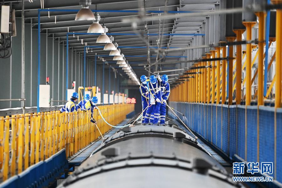 在中国铁路哈尔滨局集团有限公司三棵树车辆段的整备库,工作人员为往返于哈尔滨与广州间的Z237/8次旅客列车洗刷车顶(2月1日摄)。新华社记者 王建威 摄