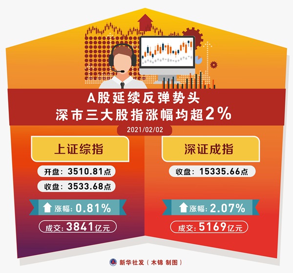 新华社上海2月2日电(记者潘清)延续2月首个交易日反弹势头,A股主要股指2日继续上行。沪指盘中3500点失而复得,深市三大股指涨幅均超过2%。